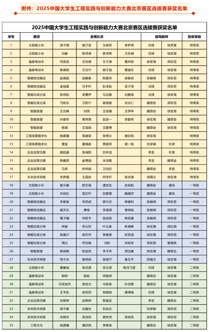 3月22~23日,为期两天的2024北京市大学生工程实践与创新能力大赛暨2025中国大学生工程实践与创新能力大赛北京赛区选拔赛在中国农业大学、北京建筑大学和北京工商大学三个赛区成功举办。我校共选拔35支参赛队、132名学生参加全部4个赛道9个赛项的比赛。我校学生刻苦备赛、奋力拼搏,在大赛中获特等奖17项,一等奖10项,二等奖8项,成绩位居北京赛区第1位,创造了我校参加该项赛事以来的历史最好成绩。
